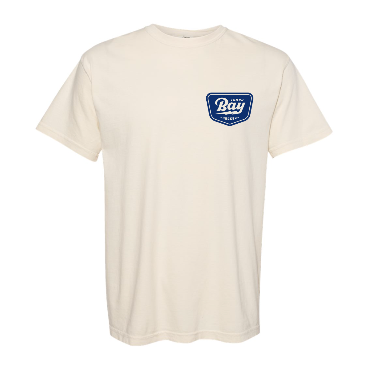 Rep your city with pride in the Bay Hockey Badge Tee – a clean and bold design built for true Tampa Bay fans. Featuring a standout navy Badge graphic with vintage-inspired script detail, this tee captures the energy of Bay hockey culture. Printed on a premium cream tee for a timeless look that goes from the rink to the streets, it’s the perfect way to show you’re For The Bay.