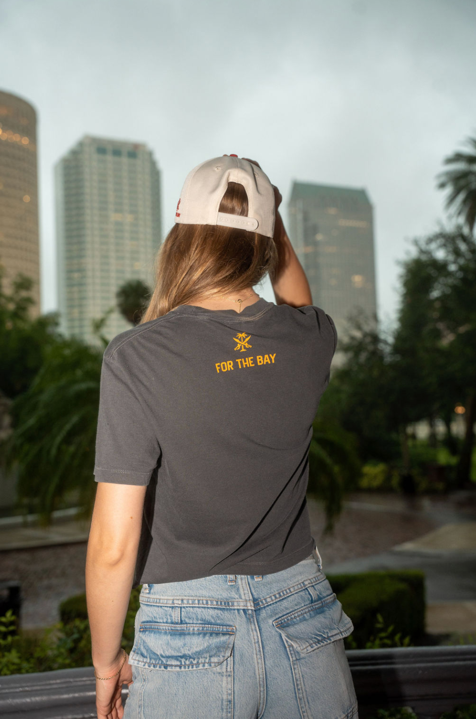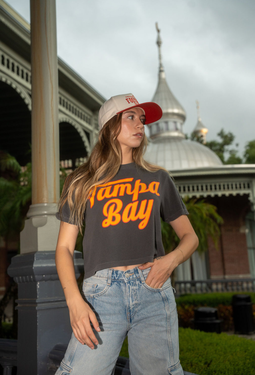 Featuring a retro-inspired script design in vibrant orange on a charcoal base, this crop brings old-school football vibes with modern comfort. Perfect for game days, tailgates, or just showing off your Tampa Bay roots, it’s built with soft, breathable cotton for an all-day comfortable fit. Whether you’re cheering from the stands or repping the Bay year-round, ladies this crop is your go-to gear for football season.