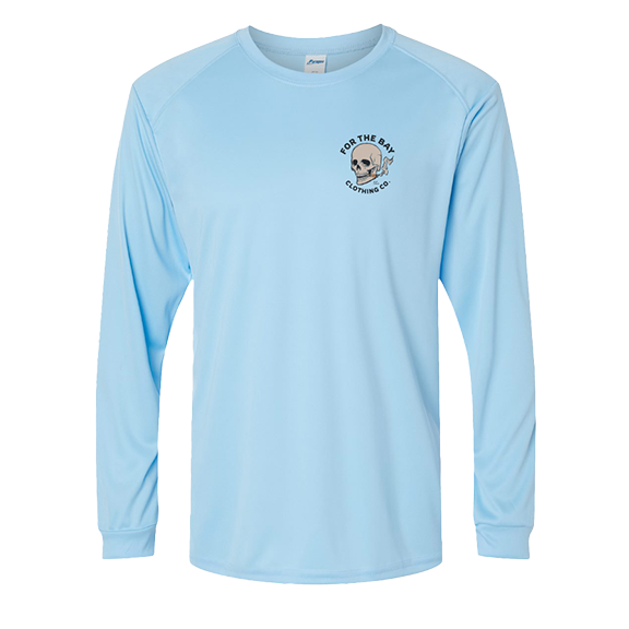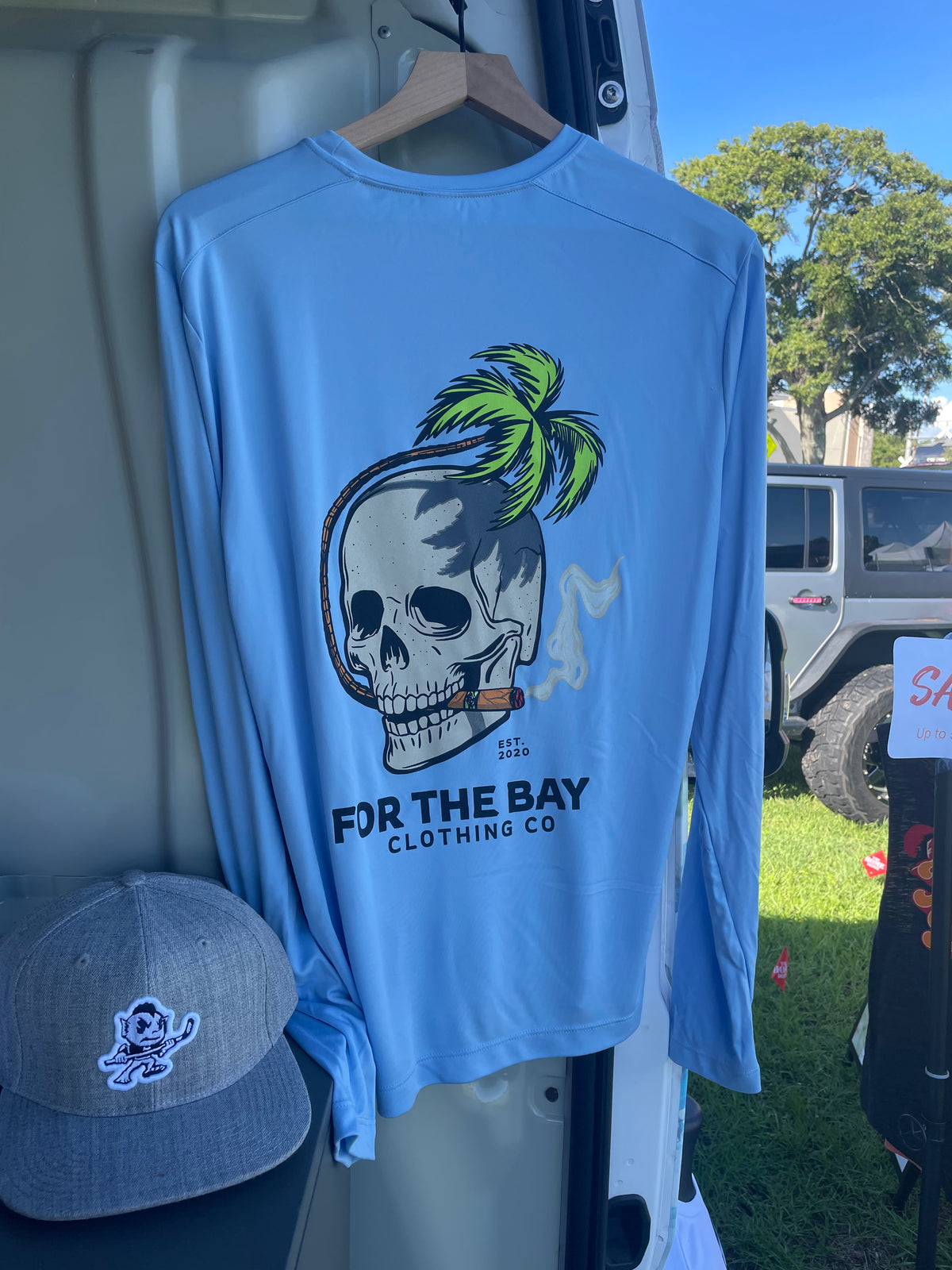 What's more Tampa Bay than Skull, Palm Trees, & Cigars? We've got the perfect tee for you to wear out on the water! Enjoy this SPF50 light blue sun shirt with our Newest For the Bay Design!