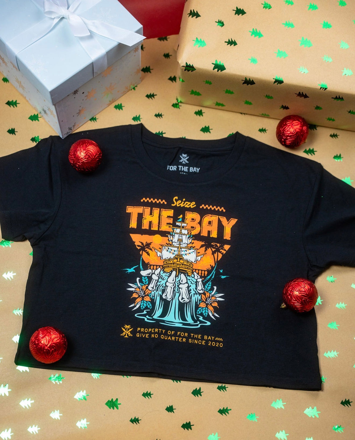 Featuring vibrant sunset tones, iconic ship artwork, and our signature For The Bay detailing, this premium cropped tee is soft, lightweight, and made to move with you—from parade routes to post-pirate parties.
